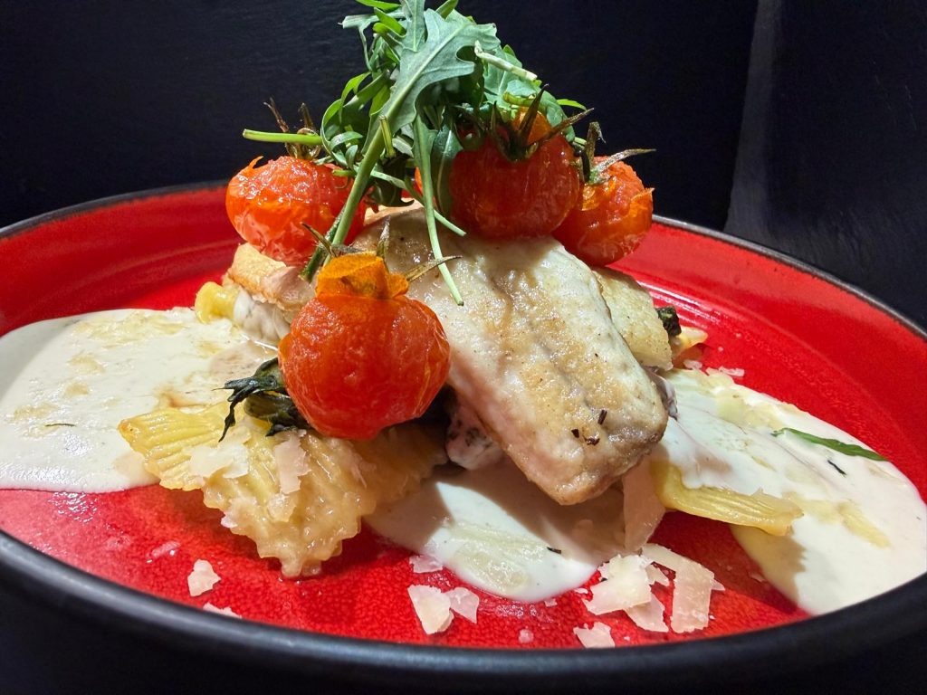 Fischduett (Tagesfang) mit Blattspinat, Ravioli in Noilly Prat Sauce