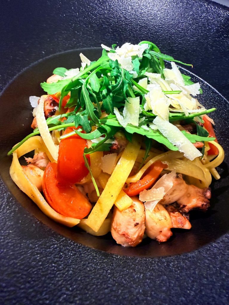 Tagliatelle Pulpo mit Knoblauch, Peperoni, Olivenöl, Kirschtomaten und Parmesan