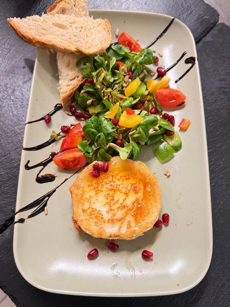 Feldsalat mit gratiniertem Ziegenkäse, Blütenhonig und gerösteten Kernen